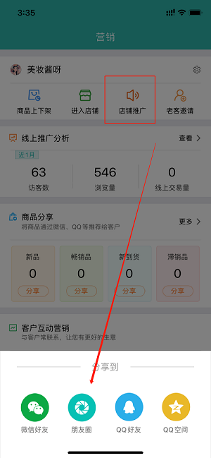 2. 搭建美妆线上店铺,通过线上的方式分享店铺到朋友圈、微信群等渠道,同时在线下店铺放上美妆旺铺二维码,介绍可以通过线上下单的方式,多种渠道吸引客户进店。