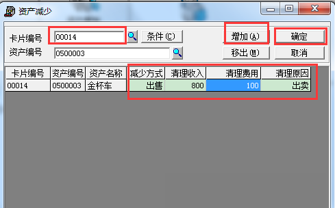 2、参照卡片编号,点击“增加”按钮,录入信息。点击“确定”按钮。