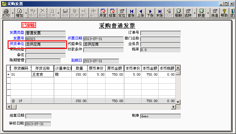 (3)填制一张总供应商的采购发票,数量150,单价5元(打开采购模块,点击“采购发票”图标-“增加