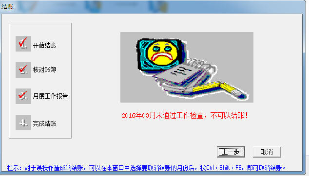 点上一步能看到不能结账的原因,点上一步,看下提示的有哪些工作没有完成,按照提示的完成之后再结账。