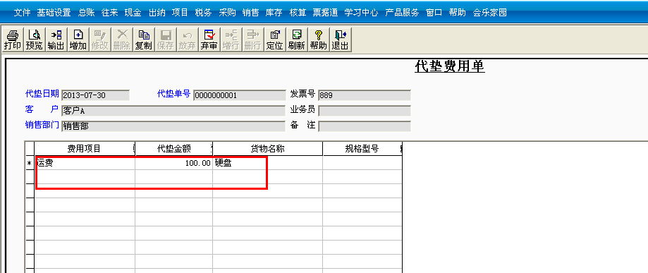 (4)点击发票上“代垫”按钮生成代垫费用单,填制100元的运费代垫费用单。