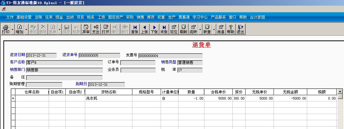 客户一年内经销本公司洗衣机1000台,可每台返利5元,当客户年内累计从本公司进货达1000台时,在年底给该客户一次性返利5000元,如何使用退补功能实现返利业务?在T3软件怎么操作?