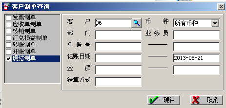 (2)到核算模块制单,点击“客户往来制单”选择“现结制单”后点击“确定”,可见没有该单据记录: