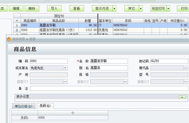 这里的条码是不会显示的,必须将条码录入在单位价格信息中的条码处才可以。