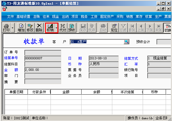 客户A向本企业购买10吨木材,单价200元,本企业已开销售发票且已做了收款核销操作,但款项尚未收到,本企业在T3软件中该如何取消操作?