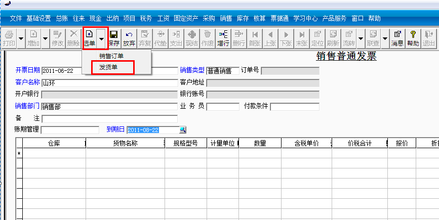 3、点击“选单”边上的下拉箭头,点击发货单(软件中可以通过发货单来流转发票)。
