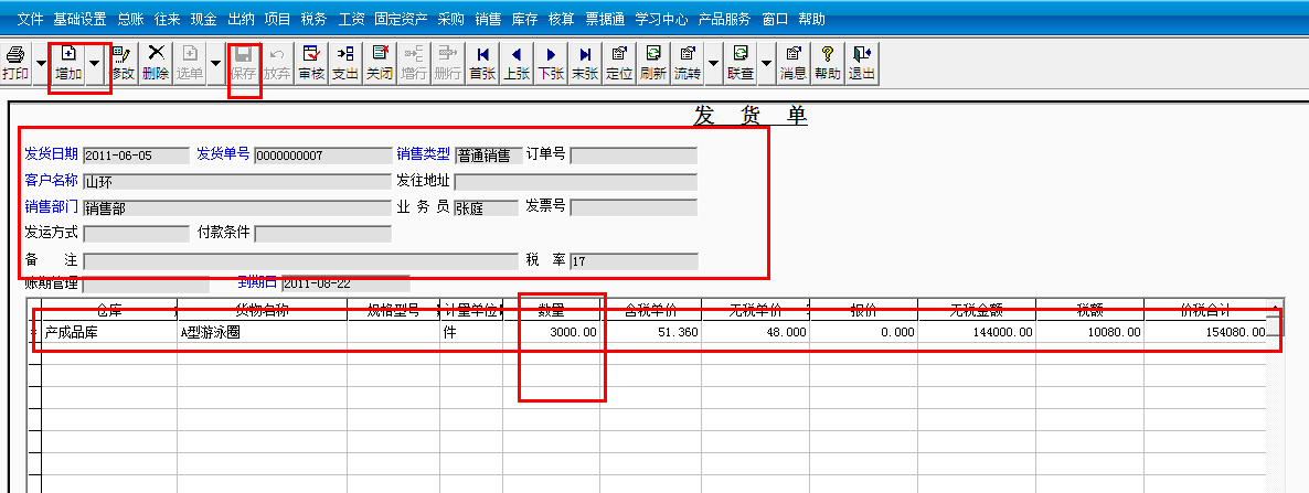 1、在销售管理中根据实际三次发货情况填制三张发货单。(如6月5日发货3000,6月18日发货4000,6月25日3000)