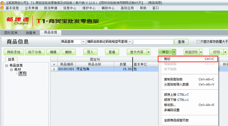 1、登陆软件打开基本信息商品信息,选择需要变更的商品,点击"其他"里面的剪切按钮。