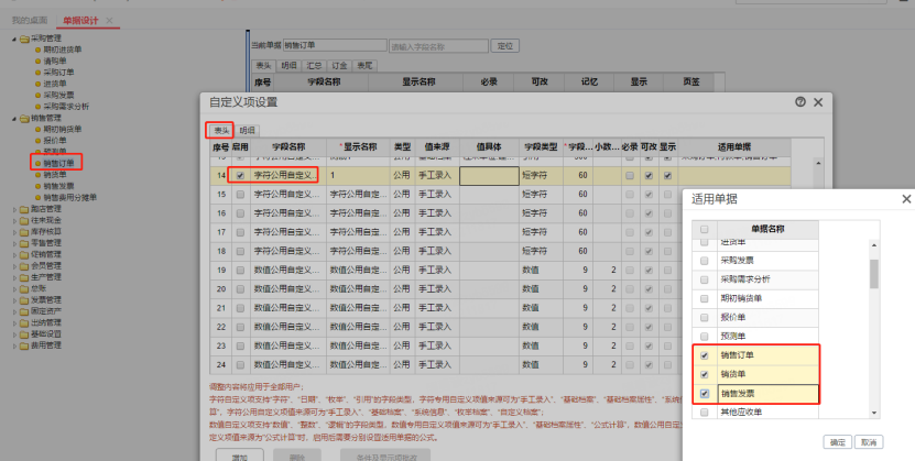 1. 自定义项设置中,要选择公用自定义项,适用单据选择销售订单,销货单和销售发票。