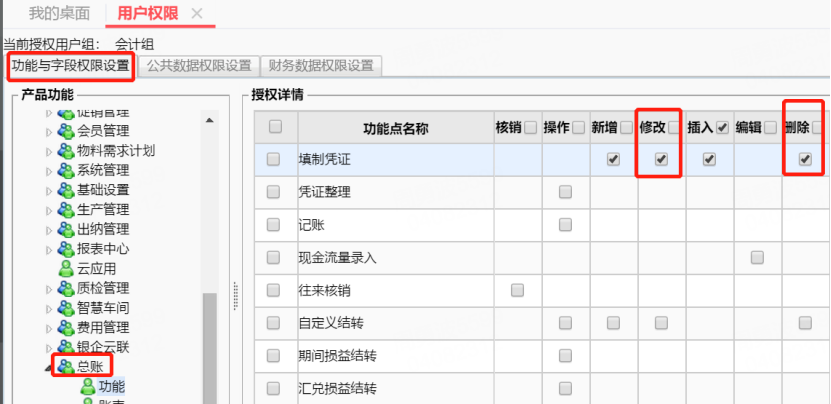 1. 在【系统管理】-【用户权限】选择对应的组进行【组授权】-【功能字段权限设置】,对会计张三、李四、王二授于查看、新增、修改、删除、审核等权限(此时都能修改、删除彼此做的凭证);