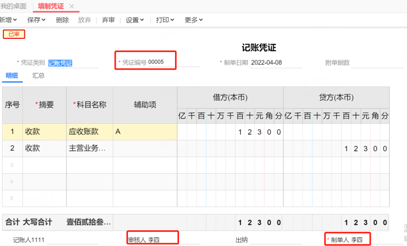 3. 分别登入张三、李四两个用户填制凭证,会计张三新增凭证00004,之后用会计李四登入新增凭证00005,之后张三再登入可以查看和弃审李四制作的凭证,不能修改,表头也没有删除字段。