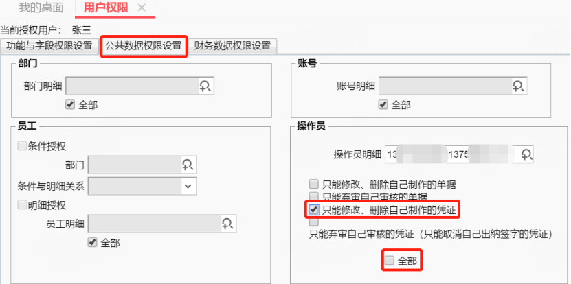 2. 在【系统管理】-【用户权限】选择对应的会计进行【用户授权】-【公共数据权限】把操作员中的全部取消勾选,在操作员明细选中张三、李四、王二3个会计,同时勾选【只能修改、删除自己制作的凭证】(这样一来就可以看到彼此的凭证,但是只能修改、删除自己制作的凭证);