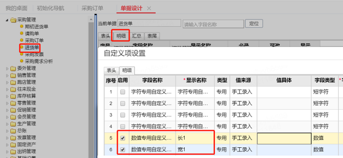 1.设置单据的数值自定义项,在【系统管理】-【单据设计】中分别设置两个自定义项【长】和【宽】;