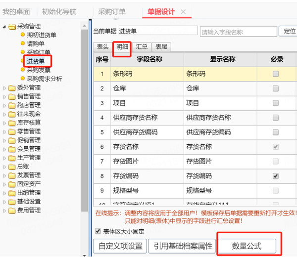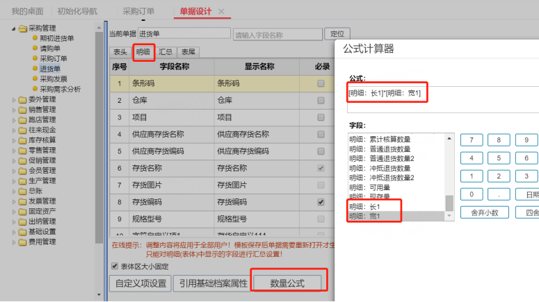 2.在单据设计中,点击【明细】页签,点击最下方的【数量公式】;