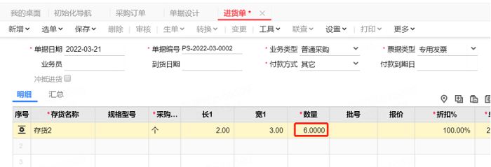 4.这样做单据的时候,我们录入长和宽的数值后,【数量】的值就会自动换算出来。