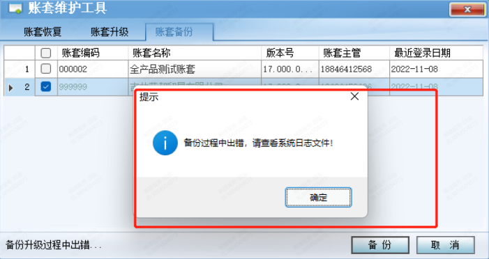 在账套维护工具备份账套时提示“备份过程中出错,请查看系统日志文件”