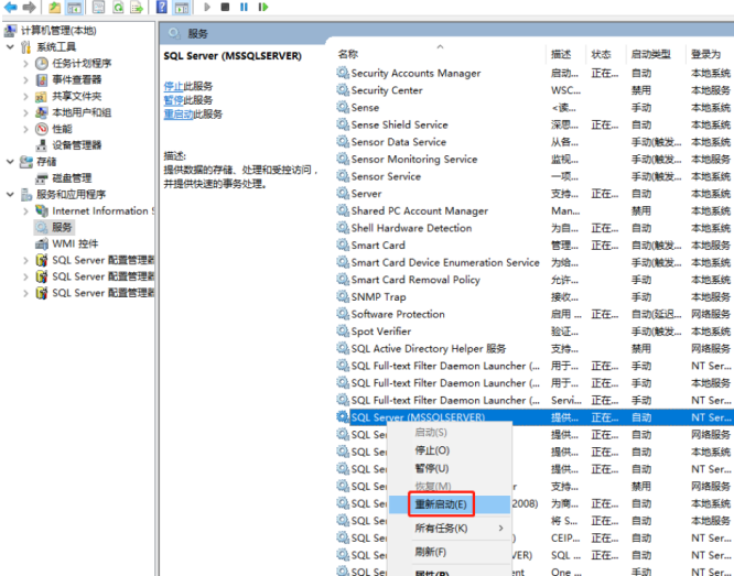 点击“开始”—“控制面板”—“管理工具”—“服务”,找到数据库服务SQL Server(MSSQLSERVER),点击右键,将服务重新启动。