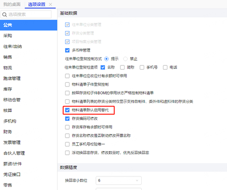 启用了生产及物料需求计划之后,在系统管理-选项设置-公共下面没有看到物料清单默认启用替代件的选项。