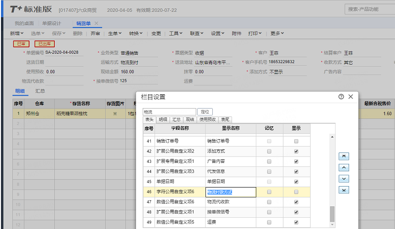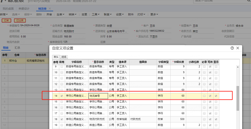 销货单、销售出库单设置的表头自定义字段 物流单号,在销货单上不显示,出库单上就正常显示,客户年前都正常录入,近期才找不到的,如附件图,自定义字段之前设置的是销货单和出库单显示,之前都正常,最近销货单表头没有物流单号这个字段,出库单依然有。已尝试新增单据字段,显示正常。原有的调不出。