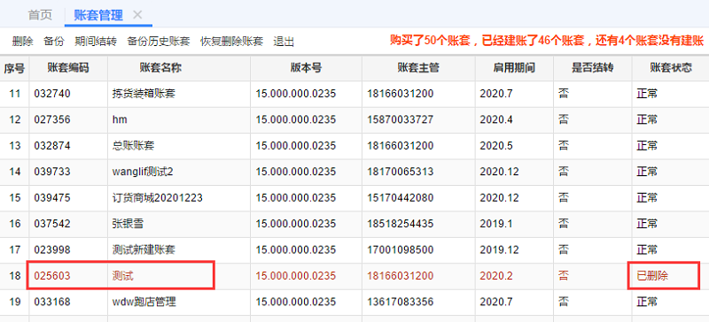 T+C企业管理员的“账套管理”中新增了两项功能“备份历史账套”、“恢复删除账套”
