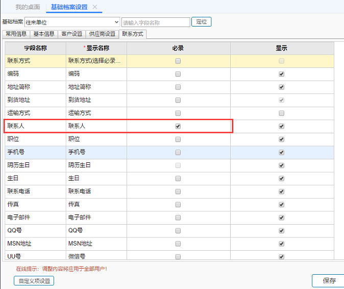 系统管理-基础档案设置中往来单位-联系方式-联系人勾选了必录。