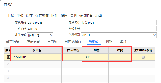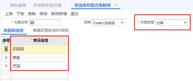 2、 在存货库存页签中,选择上面设的条码方案,并保存,