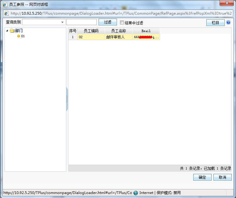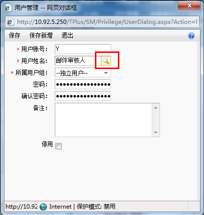 注意:“用户姓名”不能手工输入,一定要点击放大镜在员工档案参照界面选择上一步骤中新增的有邮箱地址的员工。