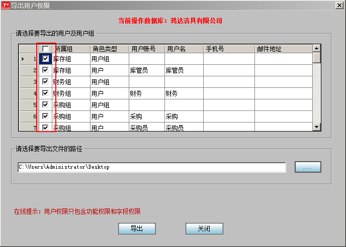 选择需要导出的具体权限,选择存放路径后点击导出: