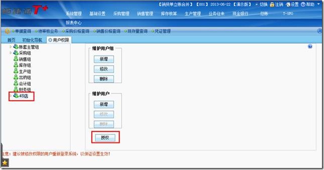 3、 增加一个“4s店”用户组,并给该组增加购销存和总账生成凭证的权限