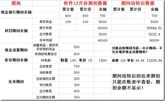 5. 演示数据是在2012年12月初启用的,启用时录入了各个期初,当月也有业务单据,期间结转后各个业务单据以及期初对应的变化如下:
