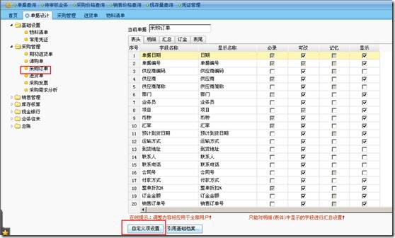 2、打开单据设计,选择采购订单,点击“自定义项设置”。