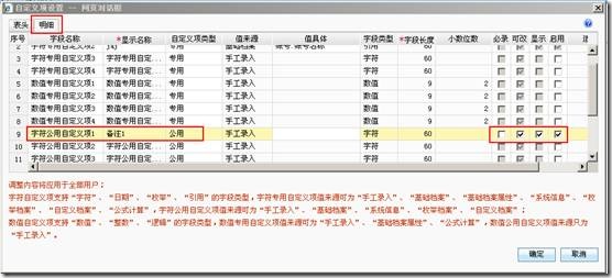 3、打开自定义设置的界面后,选择明细,启用一个“公用自定义项”,设置“显示名称”为备注1。