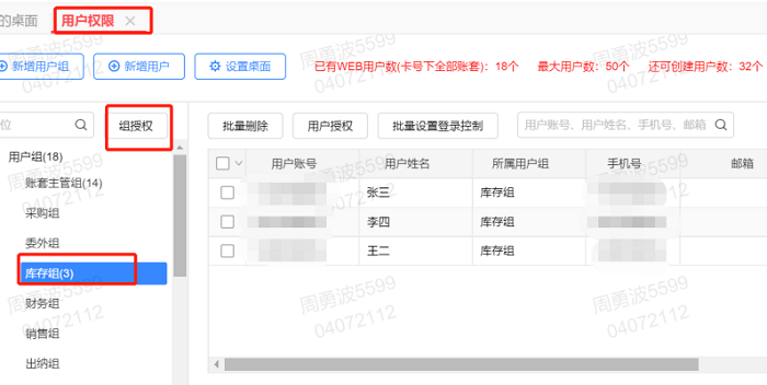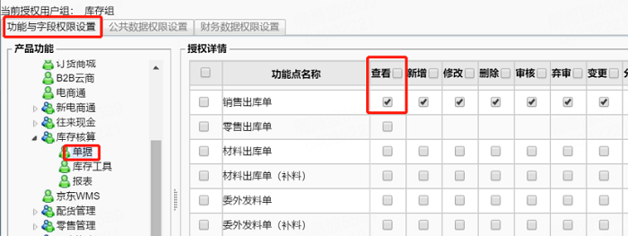 1. 在【系统管理】-【用户权限】选择对应的组进行【组授权】-【功能字段权限设置】,以销售出库单为例:对业务员工张三、李四、王二授于查看、新增、修改、删除、审核等权限(此时都能查看彼此做的单据);