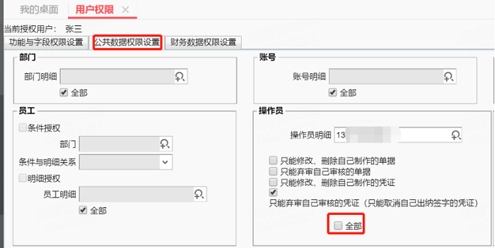 2. 在【系统管理】-【用户权限】选择对应的业务员进行【用户授权】-【公共数据权限】把操作员中的全部取消勾选,在操作员明细中只选择自己(这样一来就不能看到彼此制作的单据);