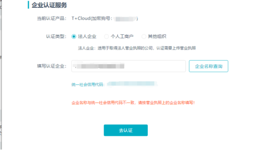 T+认证,提示企业名称与社会统一信用代码不一致,请按营业执照上的企业名称填写。但是填写的就是企业名称,并且和他现在的营业执照一样。