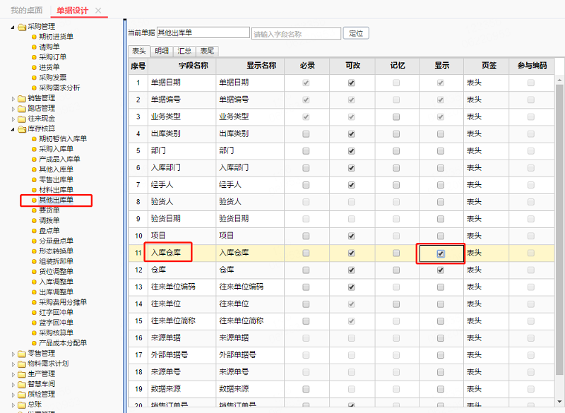 2、将其他出库单表头字段【入库仓库】勾选显示。