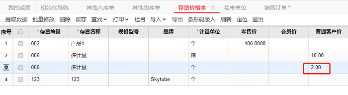 2、将销售单位切换为个后,单价没有变成1,而是变成了2,