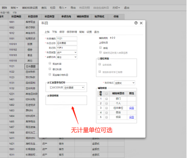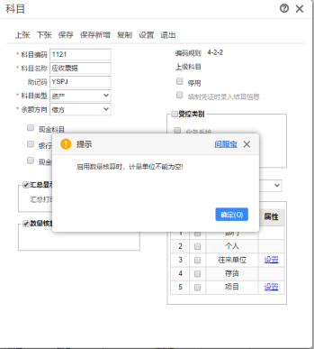 科目勾选数量核算,其下无计量单位可选择,保存提示:启用数量核算时,计量单位不能为空!
