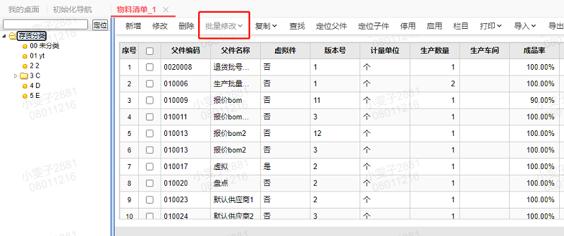 因为物料清单无审流程不允许批量修改,物料清单有审流程才支持批量修改。