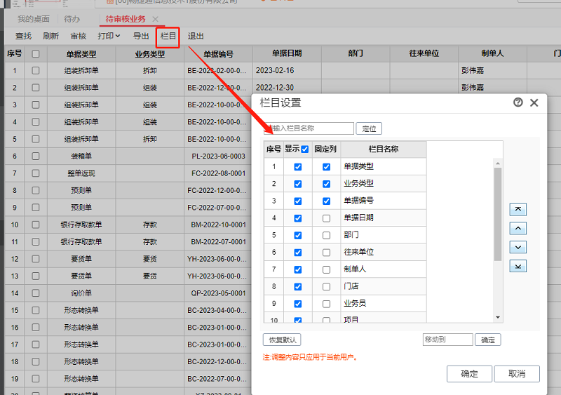 这是栏目中设置了单据类型、业务类型、单据编号为固定列,在待办业务中,如果栏目设置中有固定列的,那么点击固定列是不会跳转的。把栏目设置中的固定列取消掉,就可以正常双击单据编号查看单据明细了。