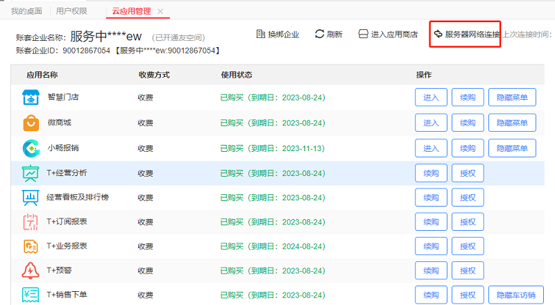 2、用授权的账号重新登录T+账套,点击云应用--云应用管理,点击服务器网络链接,然后再去授权: