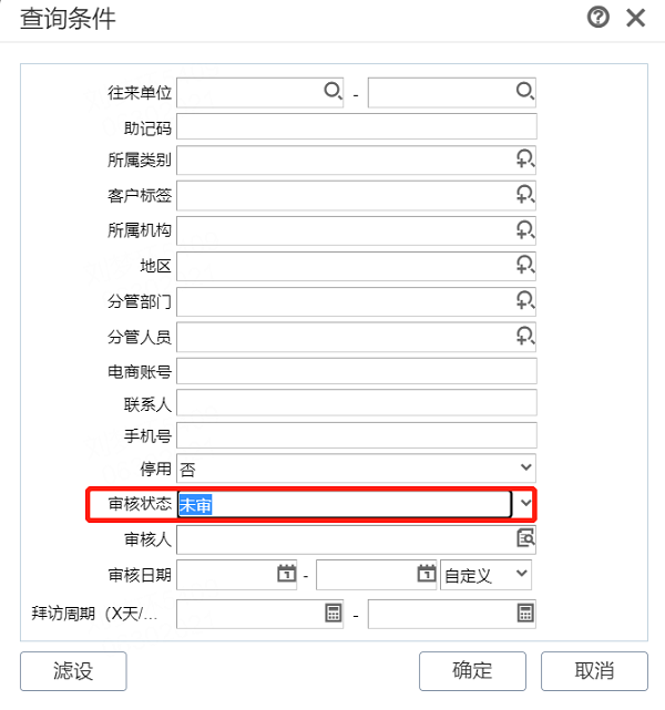 2、在【基础设置】-【往来单位】档案中点击【查找】选择【审核状态】未审后,即可查到刚导入的往来单位档案