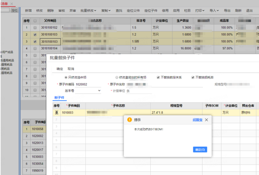 物料清单子件批量替换后提示本次成功修改0个BOM