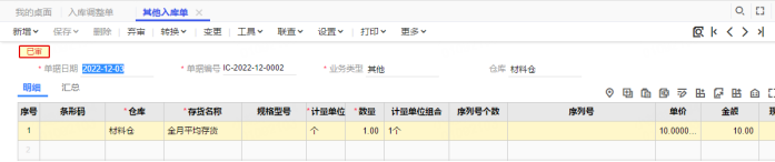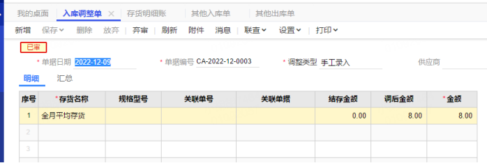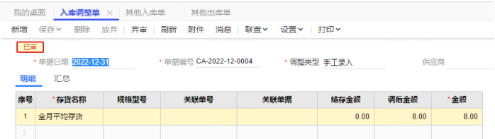 全月平均法存货不会把当月最后一天的调整单计算进去,当月最后一张调整单数据会计算到下个月。需要把入库调整单日期改成非月末最后一天日期。