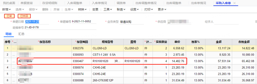 11月,采购入库单II-2021-11-0052,存货0300467,进货单PS-2021-11-0053,存货0300467,单价都是14,482.76,且都是11月份。