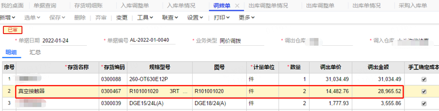 2022.6月,调拨单AL-2022-01-0040,存货0300467,调拨出库成本为14,482.76,但是该调拨生成了入库调整单CA-2022-06-0007,为采购核算