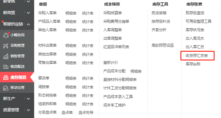 1、打开【库存核算】中的【收发存汇总表】功能。