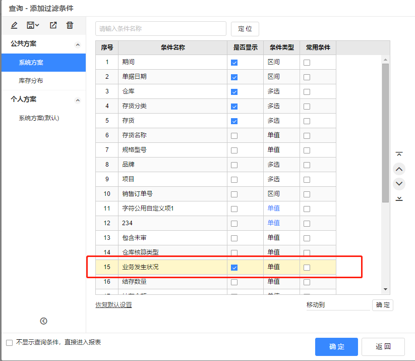 2、点击【添加过滤条件】,将【业务发生状况】这个条件显示出来。