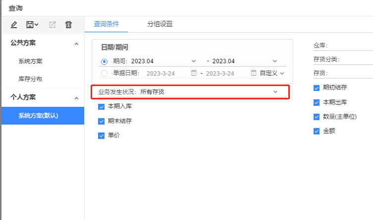 3、此时可以看到默认查询条件为【所有存货】,查询出的结果是包含了只有期初,本期无发生的数据