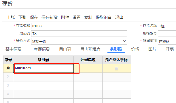 3、为存货设置包含自由项的固定条形码。